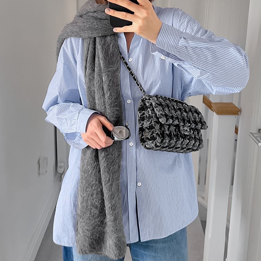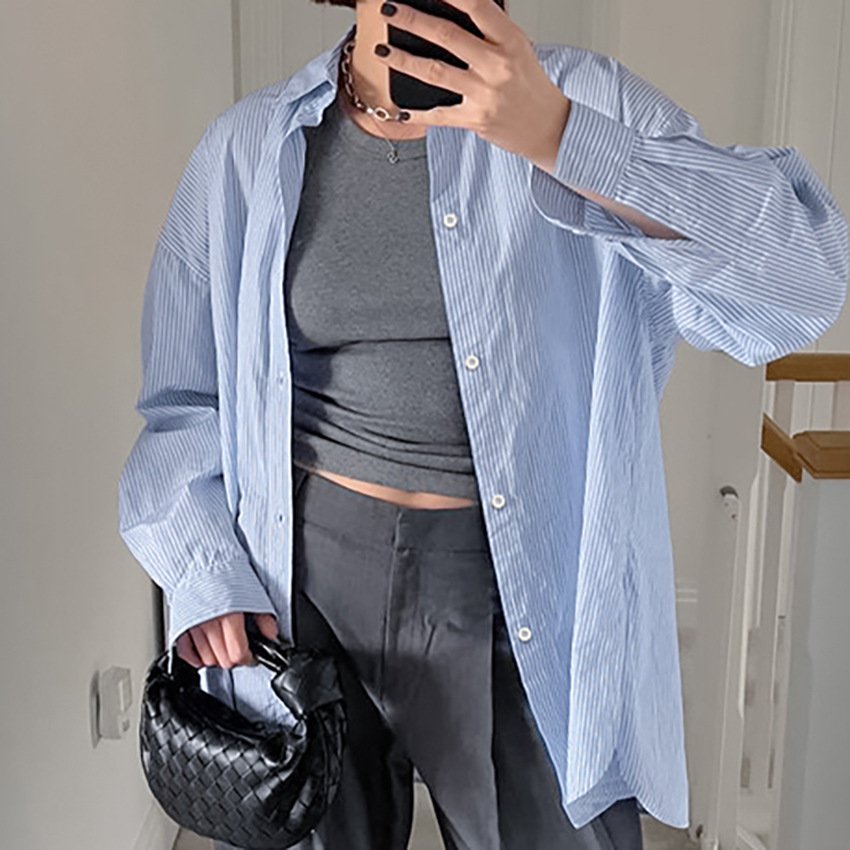 Blue striped long-sleeved shirt design is casual, fashionable and versatile for winter femininity commuting