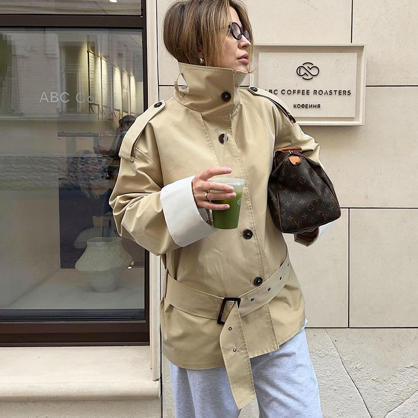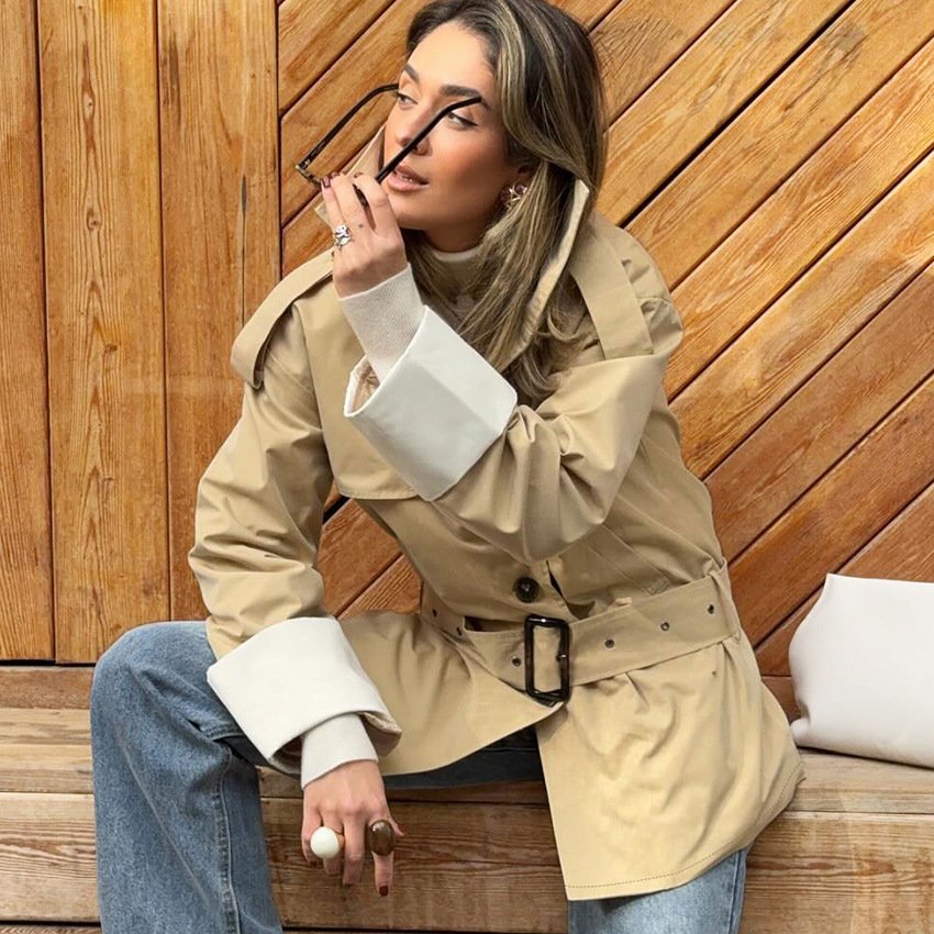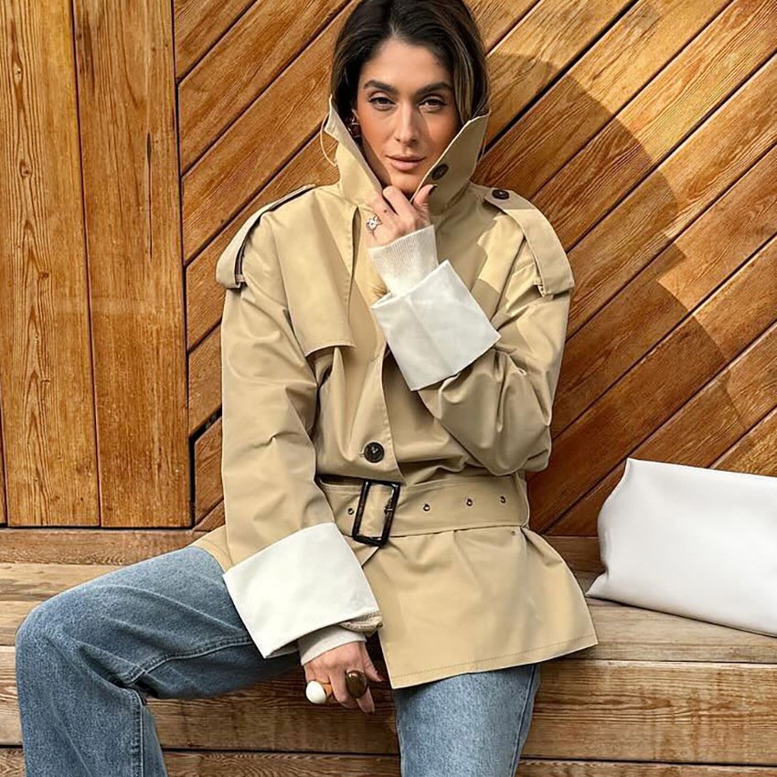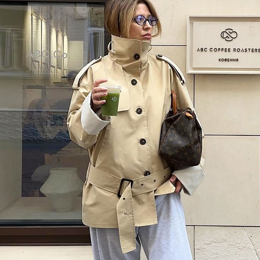 British style stand collar trench coat design, contrasting color waisted jacket for women, design sense, temperament and fashion