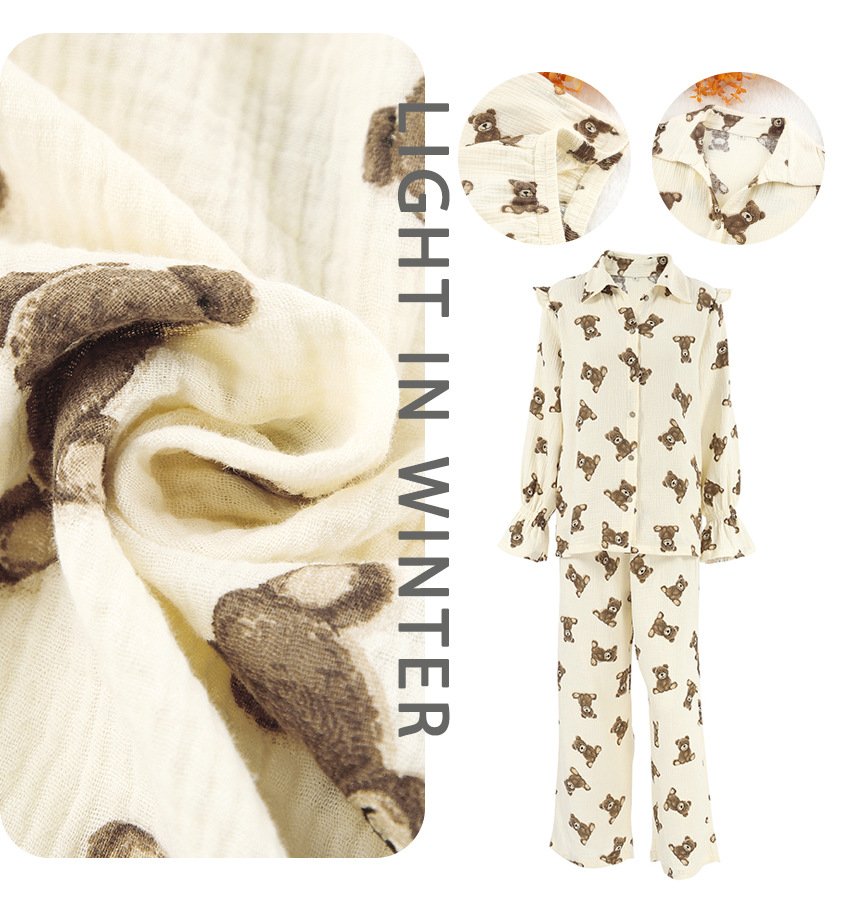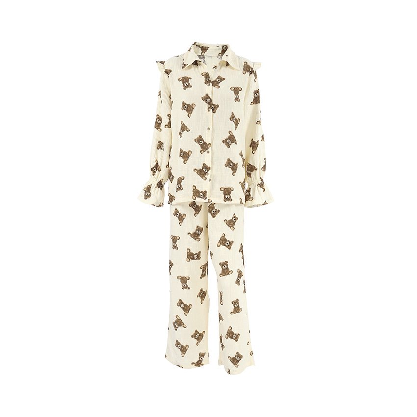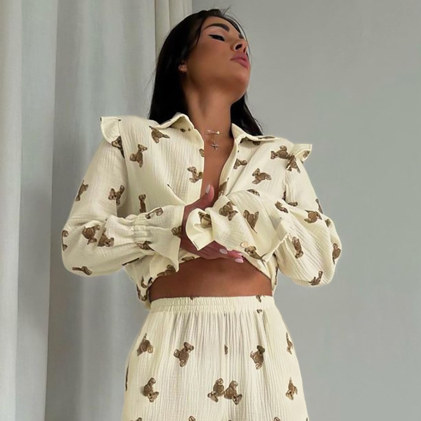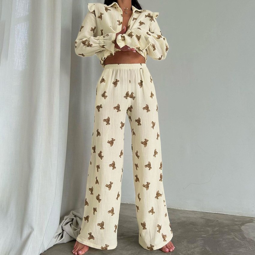 Cotton and linen long-sleeved trousers two-piece girly printed casual suit for women