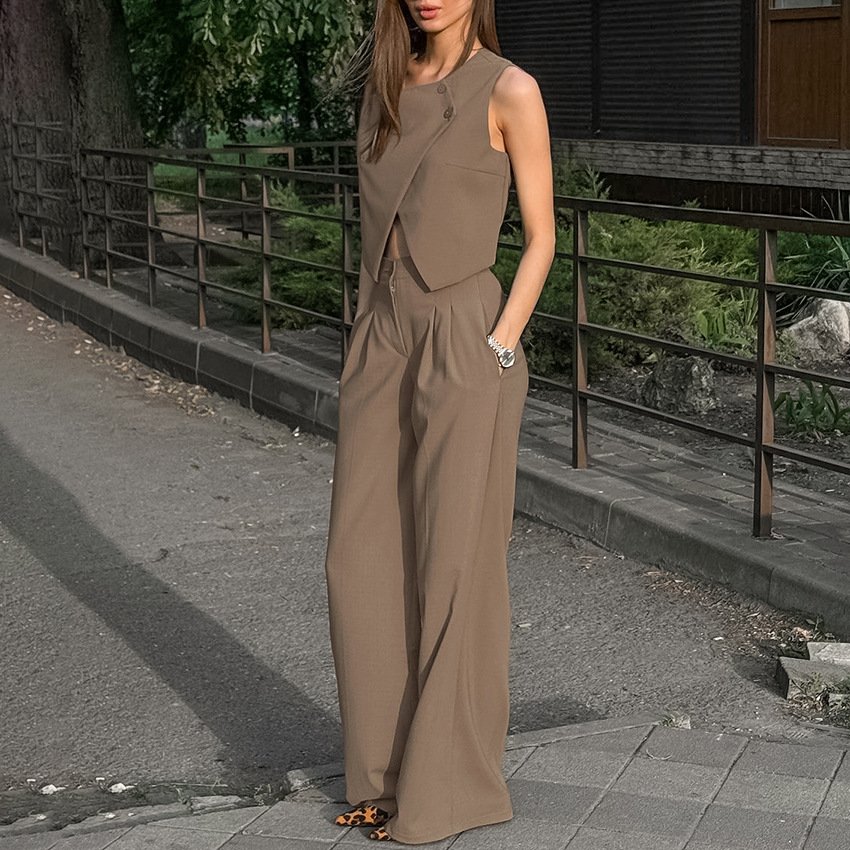Designed fashionable vest, high-waisted wide-leg pants two-piece set, elegant casual suit for women