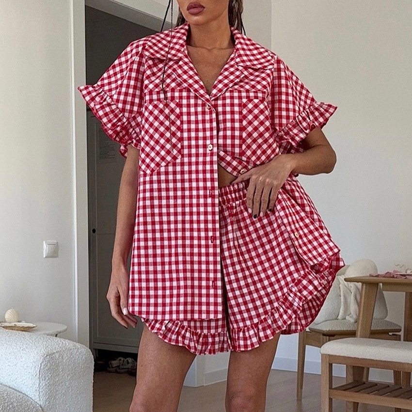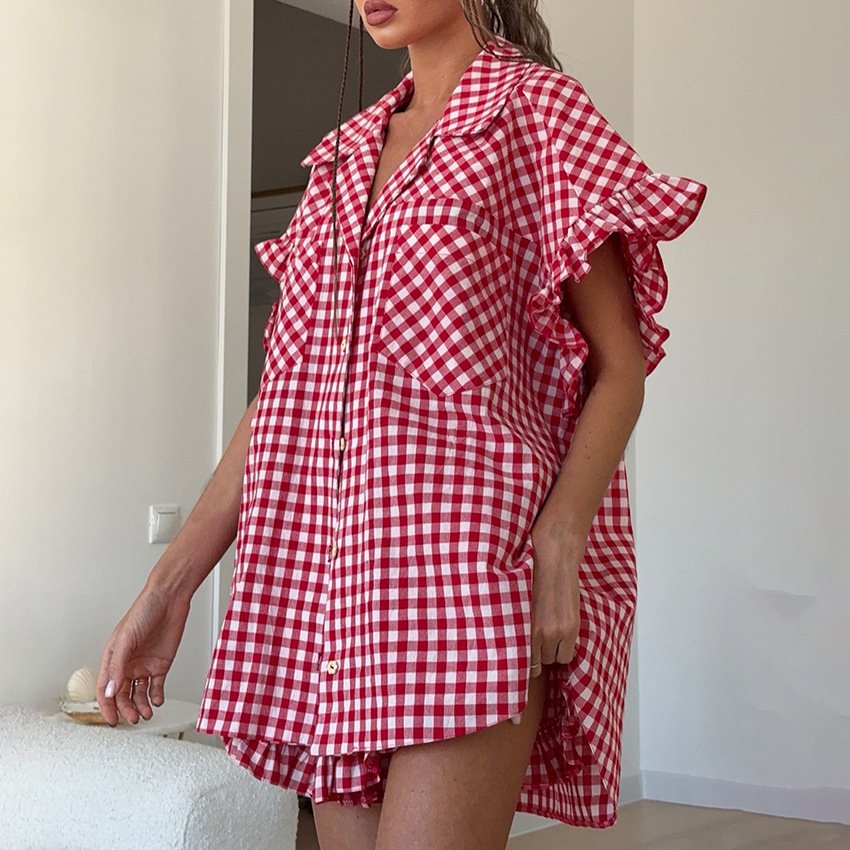 Designed ruffle fashion casual plaid shirt high waist shorts suit women’s style