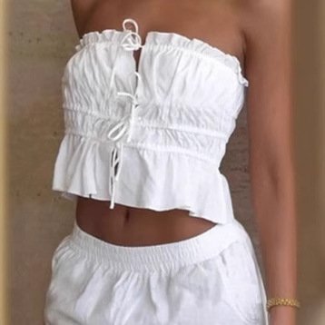 Drawstring tube top, high-waisted wide-leg trousers two-piece set with pleated design and fashionable temperament