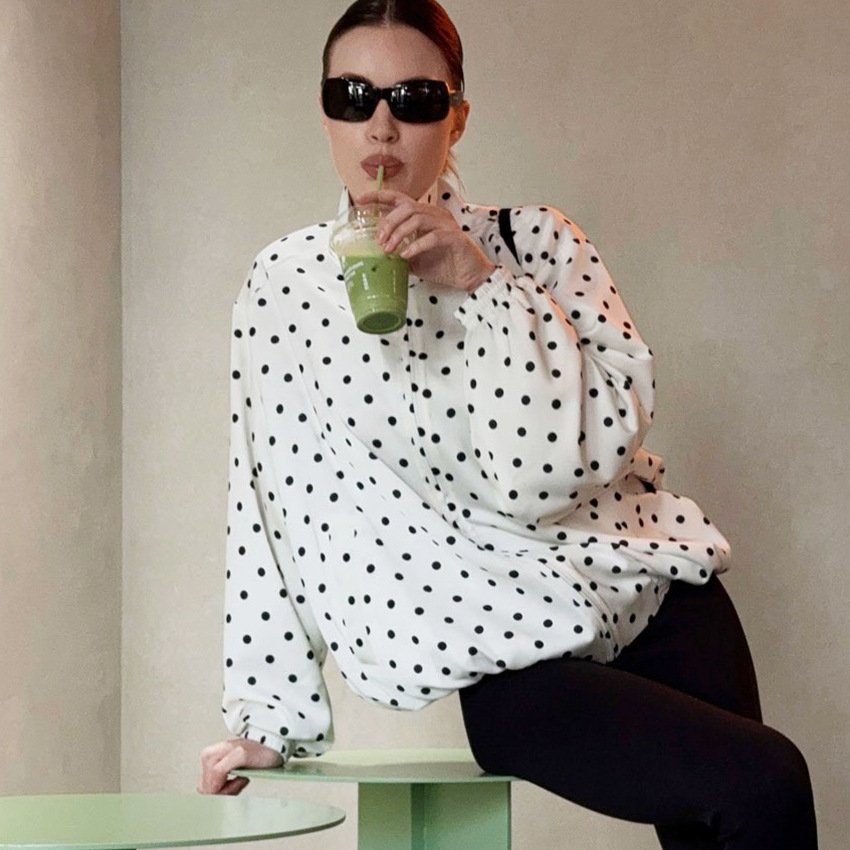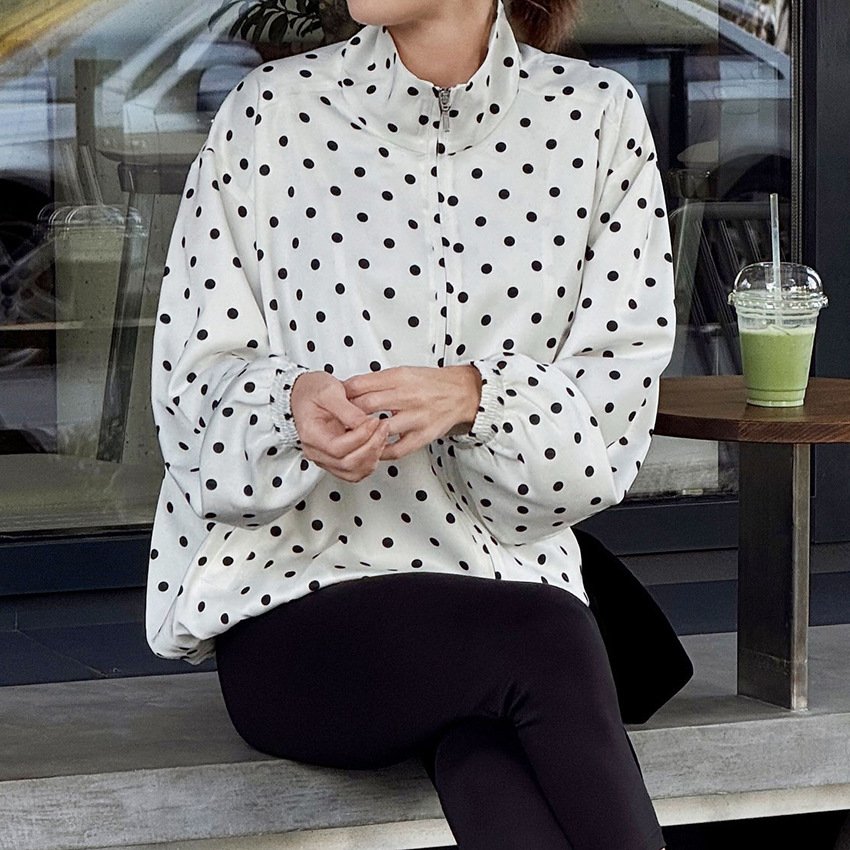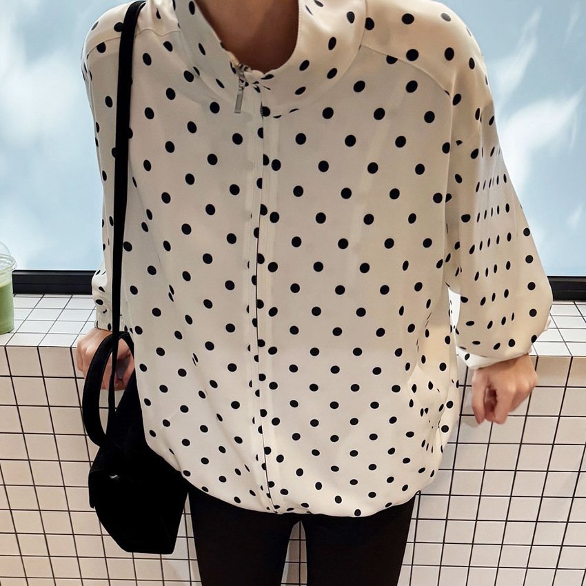 Fashionable satin polka dot stand collar jacket for women with stylish design and casual style