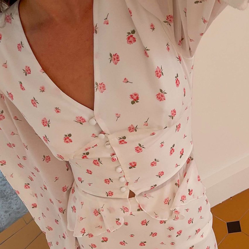 Be the first to review “Floral chiffon waist-cinching shirt and fishtail skirt suit with stylish and elegant design”