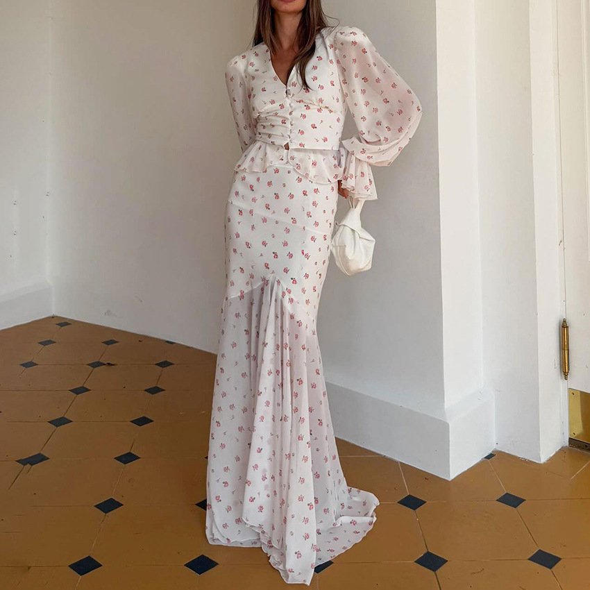 Floral chiffon waist-cinching shirt and fishtail skirt suit with stylish and elegant design