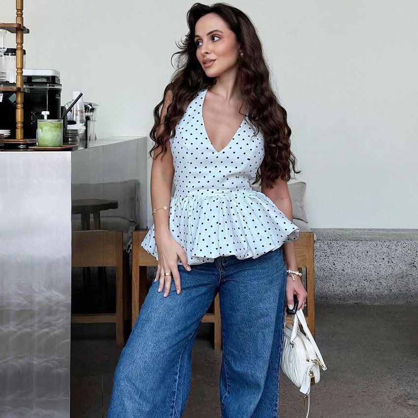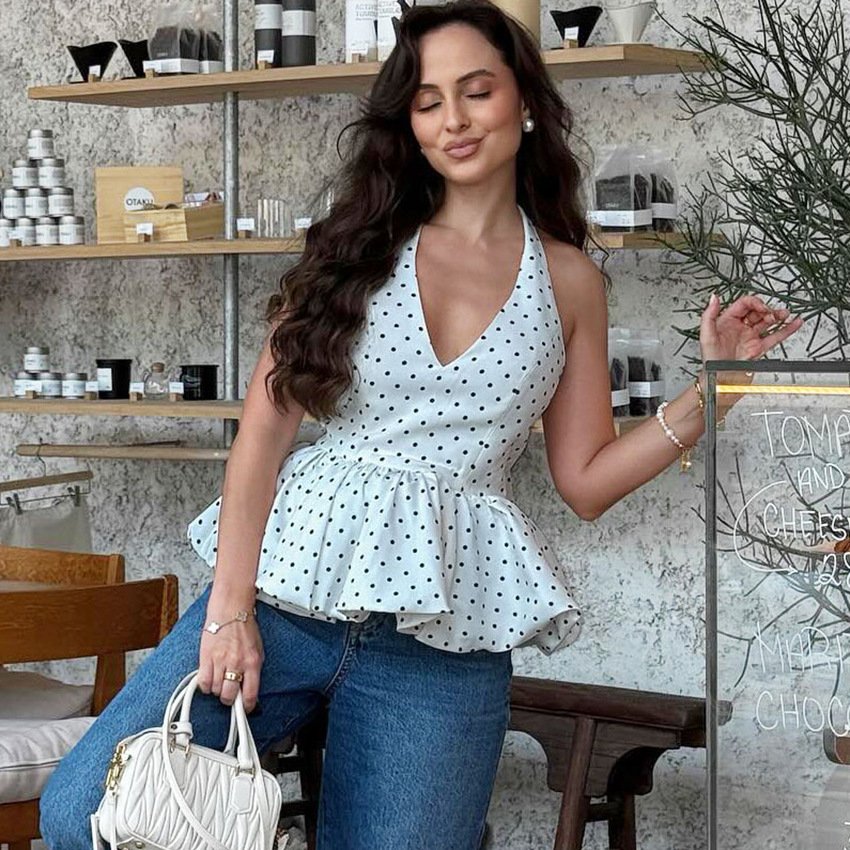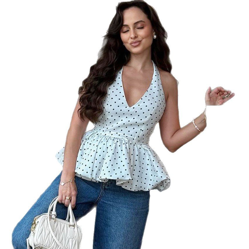 Hot girl halter neck white vest women’s ruffled temperament polka dot top