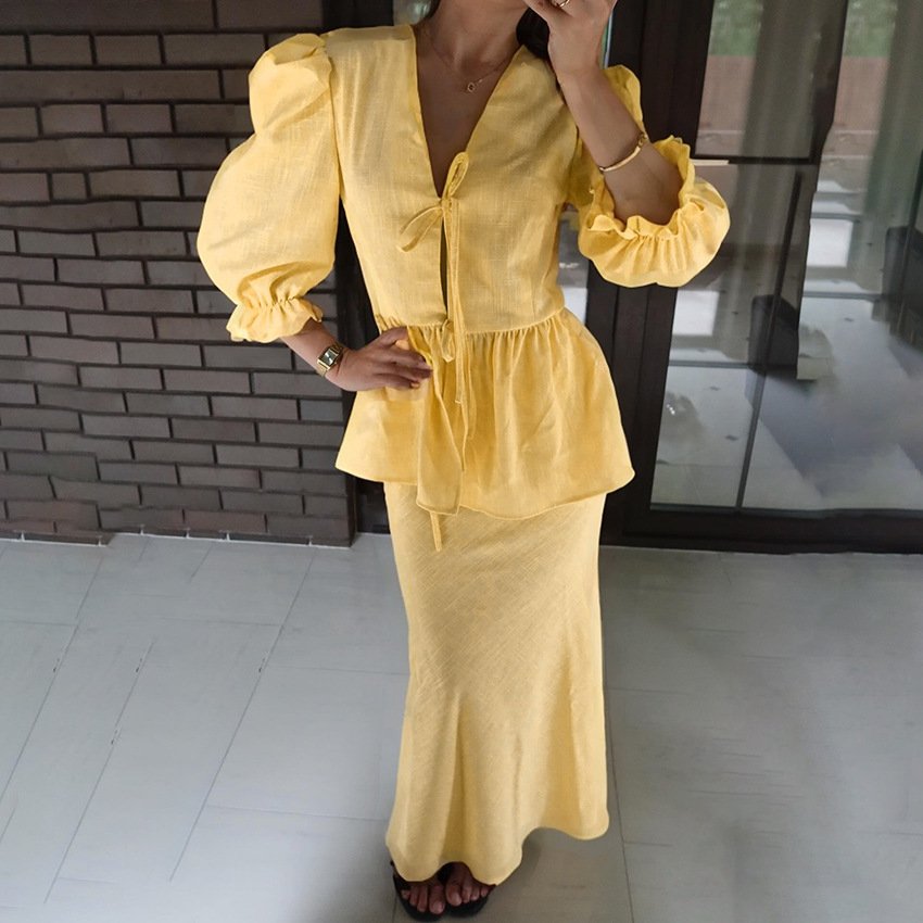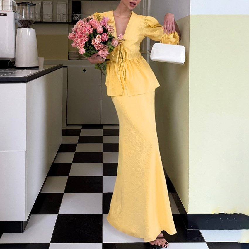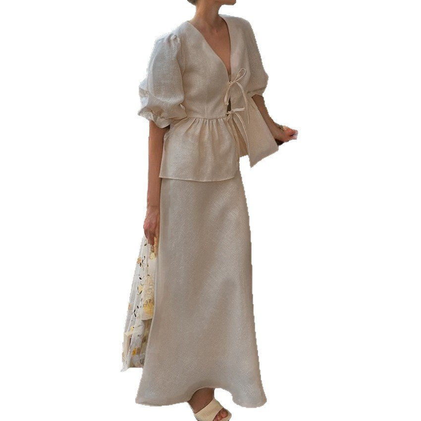 Lace-up collared shirt, puff sleeves, skirt suit, women’s design, temperament and fashion