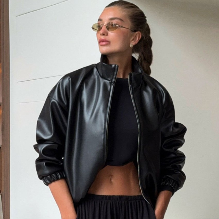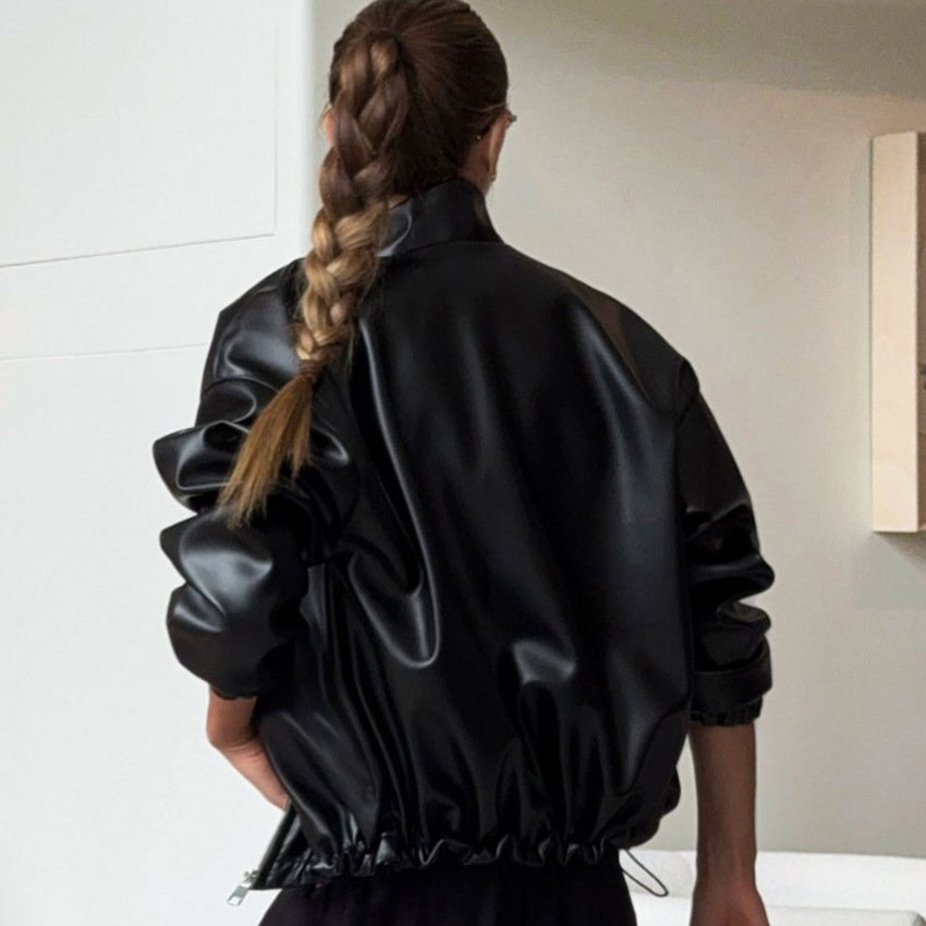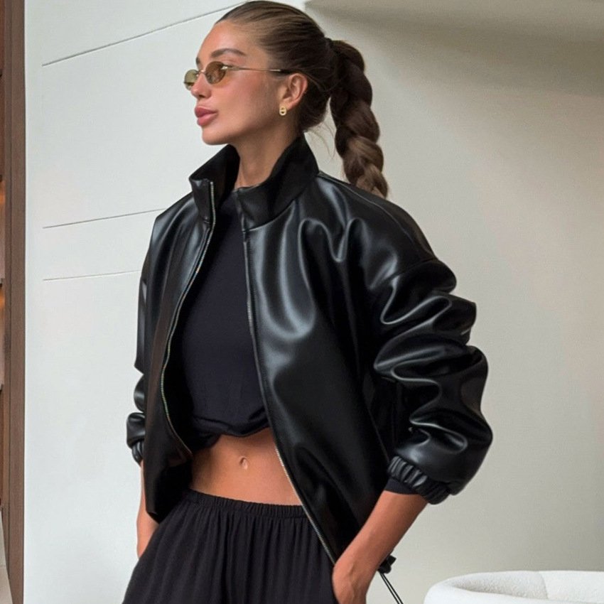 Motorcycle style funnel neck zipper top fashionable black leather jacket for women