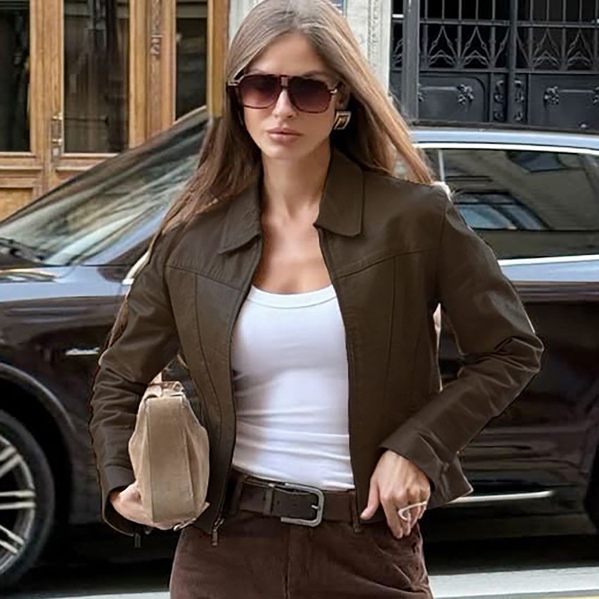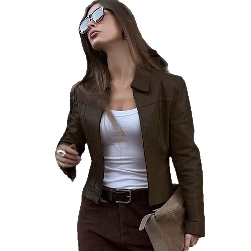 Motorcycle style leather jacket, slim fit, short design, stylish and stylish for commuting