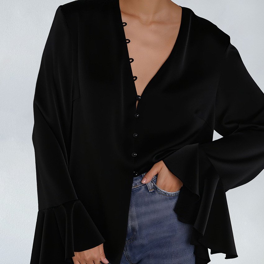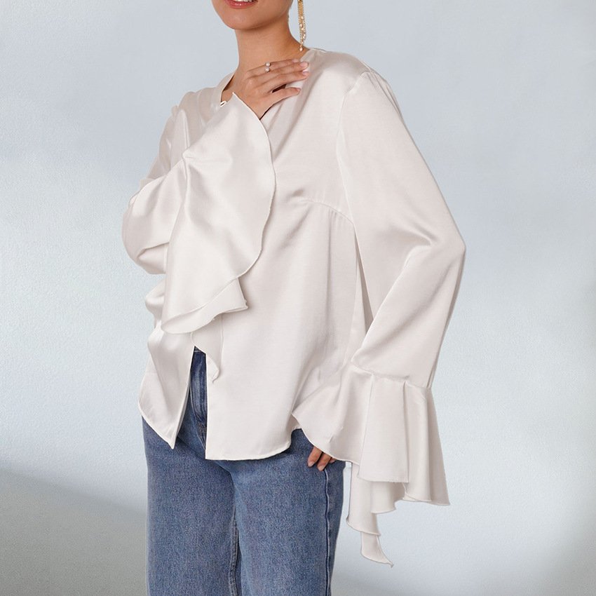 Satin ruffled shirt, solid color women’s top, design, temperament, fashionable commuting
